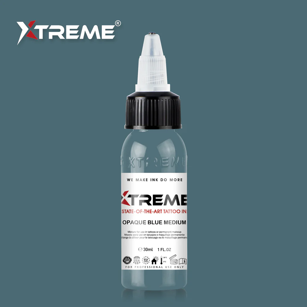 Introducing Xtreme Inks’ Opaque Blue Medium Tattoo Ink: our medium tone of opaque blue.